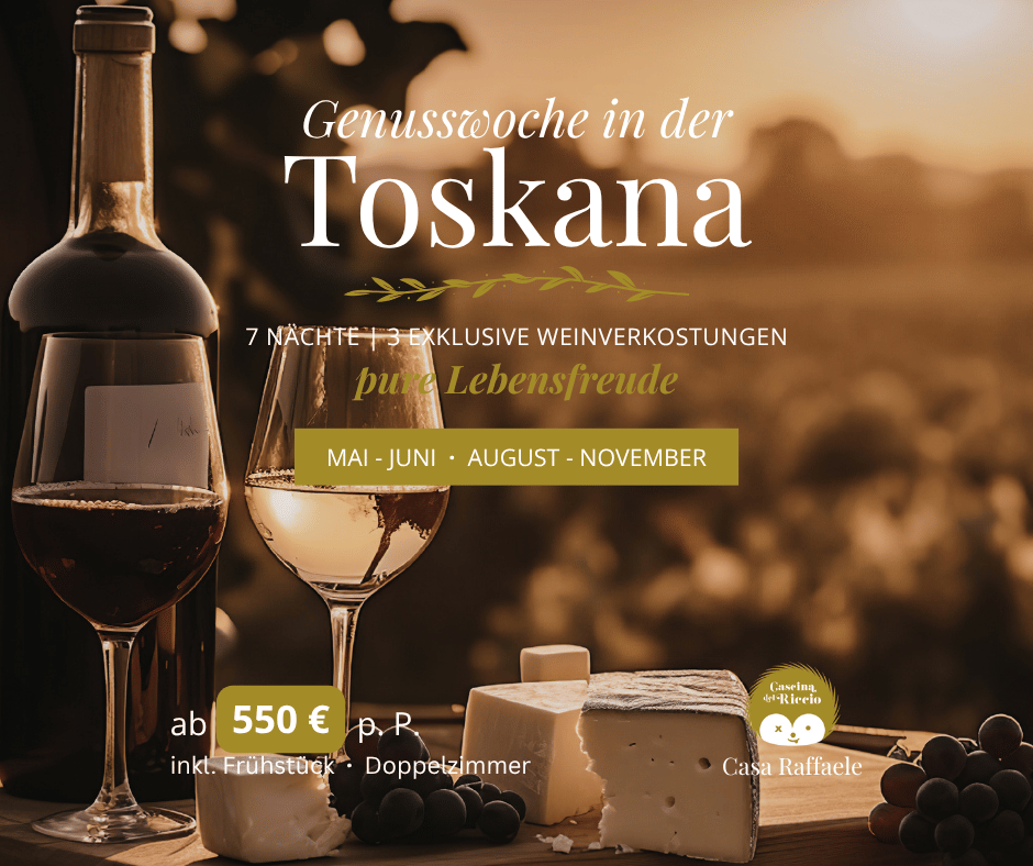Freuen Sie sich auf eine Woche in unserer Cascina mit drei exklusiven Weinverkostungen bei ausgewählten Weingütern der Region – begleitet von erfahrenen Sommeliers und authentischen Einblicken in die toskanische Weinkultur.